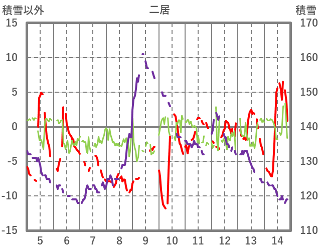 | 日 | 時 | 気温 | 降水 | 風向/風速 | 日照 | 積雪 | 降雪 |