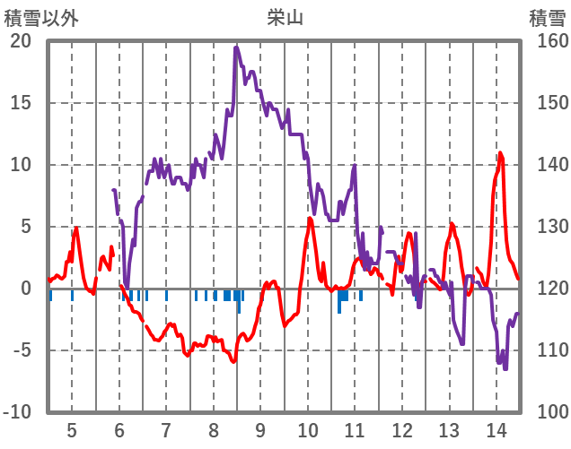 | 日 | 時 | 気温 | 降水 | 風向/風速 | 日照 | 積雪 | 降雪 |