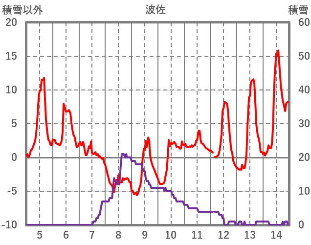 | 日 | 時 | 気温 | 降水 | 風向/風速 | 日照 | 積雪 | 降雪 |