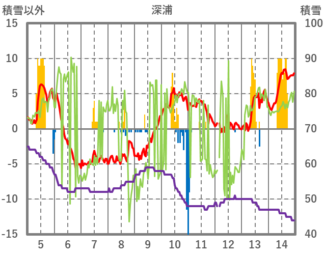 | 日 | 時 | 気温 | 降水 | 風向/風速 | 日照 | 積雪 | 降雪 |