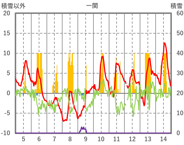 | 日 | 時 | 気温 | 降水 | 風向/風速 | 日照 | 積雪 | 降雪 |