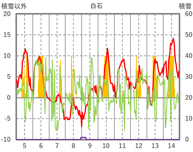 | 日 | 時 | 気温 | 降水 | 風向/風速 | 日照 | 積雪 | 降雪 |
