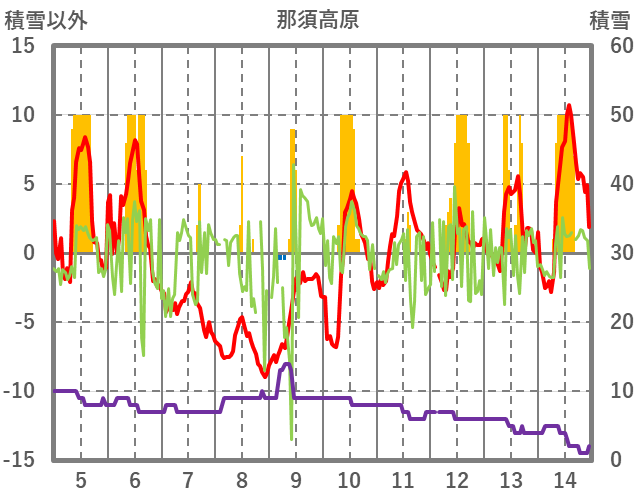| 日 | 時 | 気温 | 降水 | 風向/風速 | 日照 | 積雪 | 降雪 |