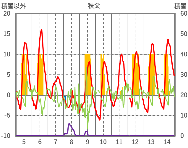 | 日 | 時 | 気温 | 降水 | 風向/風速 | 日照 | 積雪 | 降雪 |