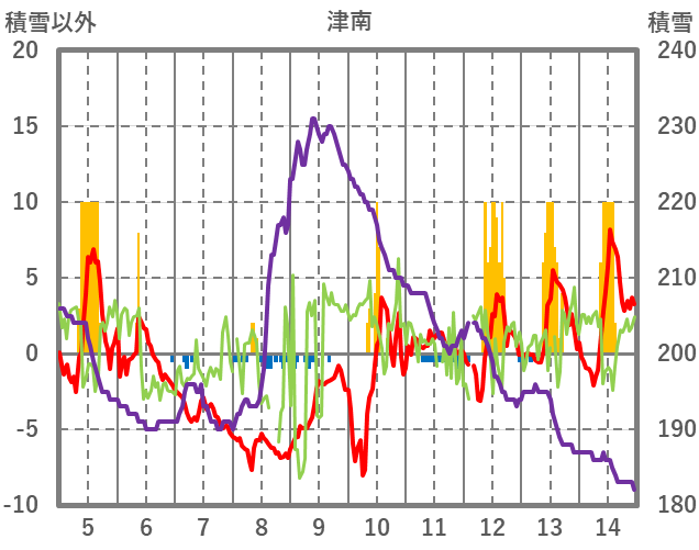 | 日 | 時 | 気温 | 降水 | 風向/風速 | 日照 | 積雪 | 降雪 |