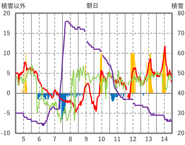 | 日 | 時 | 気温 | 降水 | 風向/風速 | 日照 | 積雪 | 降雪 |