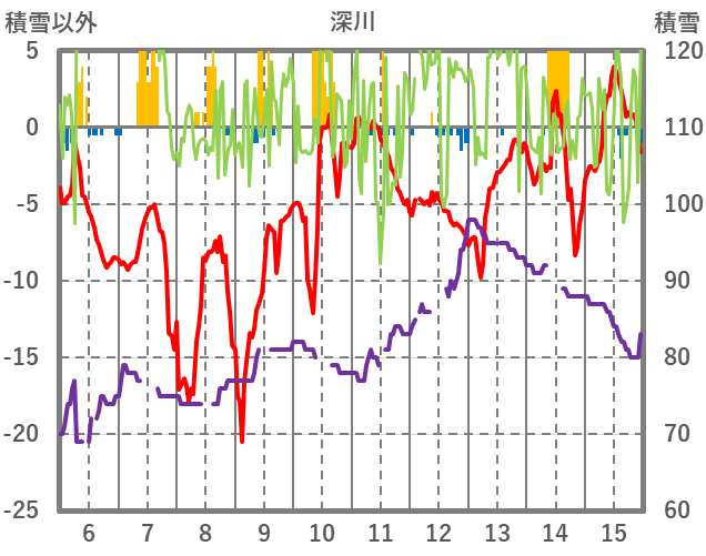 | 日 | 時 | 気温 | 降水 | 風向/風速 | 日照 | 積雪 | 降雪 |