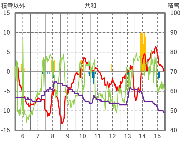 | 日 | 時 | 気温 | 降水 | 風向/風速 | 日照 | 積雪 | 降雪 |