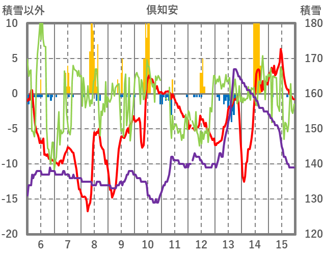 | 日 | 時 | 気温 | 降水 | 風向/風速 | 日照 | 積雪 | 降雪 |