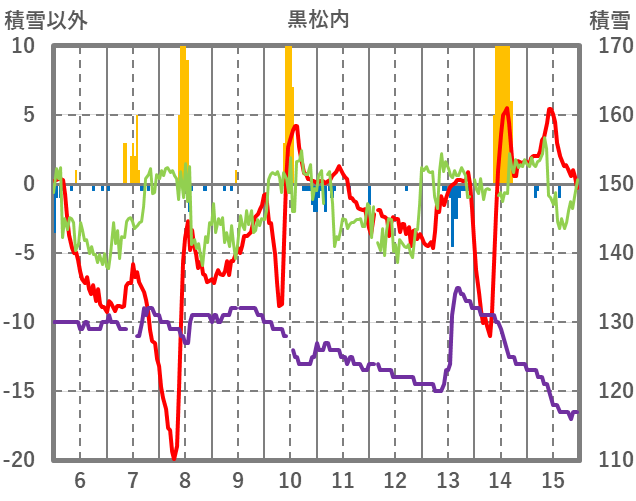 | 日 | 時 | 気温 | 降水 | 風向/風速 | 日照 | 積雪 | 降雪 |