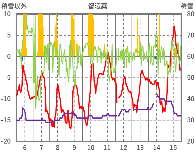 | 日 | 時 | 気温 | 降水 | 風向/風速 | 日照 | 積雪 | 降雪 |