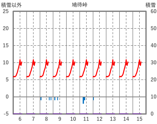 | 日 | 時 | 気温 | 降水 | 風向/風速 | 日照 | 積雪 | 降雪 |