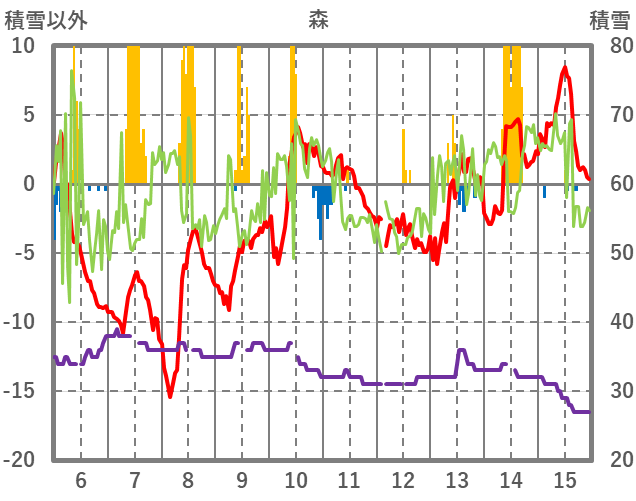 | 日 | 時 | 気温 | 降水 | 風向/風速 | 日照 | 積雪 | 降雪 |