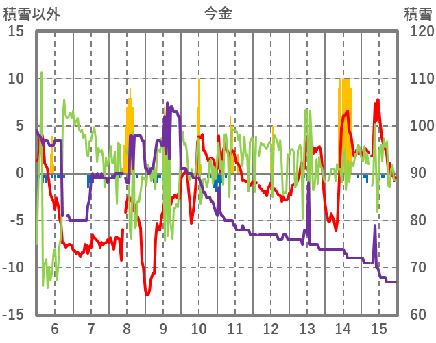 | 日 | 時 | 気温 | 降水 | 風向/風速 | 日照 | 積雪 | 降雪 |
