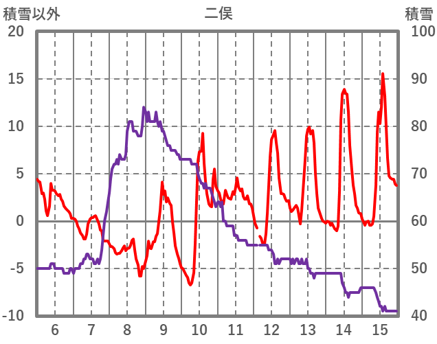 | 日 | 時 | 気温 | 降水 | 風向/風速 | 日照 | 積雪 | 降雪 |