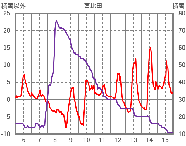 | 日 | 時 | 気温 | 降水 | 風向/風速 | 日照 | 積雪 | 降雪 |