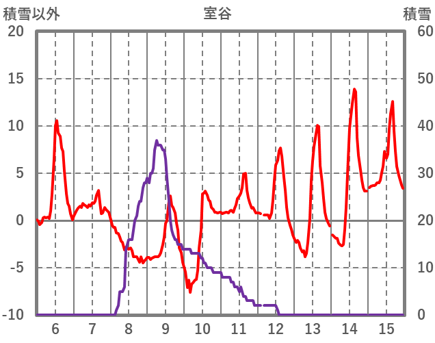 | 日 | 時 | 気温 | 降水 | 風向/風速 | 日照 | 積雪 | 降雪 |