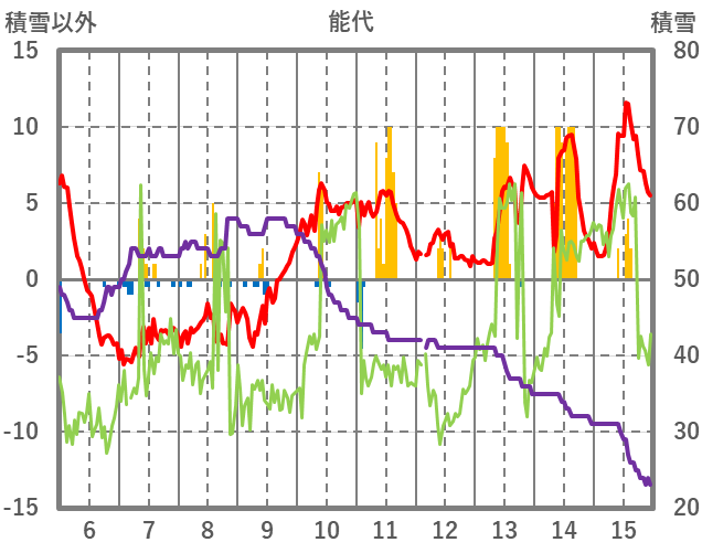 | 日 | 時 | 気温 | 降水 | 風向/風速 | 日照 | 積雪 | 降雪 |