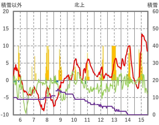 | 日 | 時 | 気温 | 降水 | 風向/風速 | 日照 | 積雪 | 降雪 |