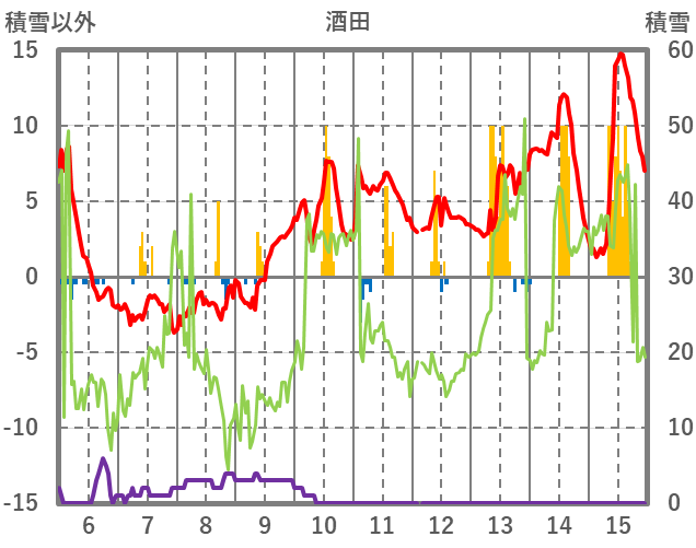 | 日 | 時 | 気温 | 降水 | 風向/風速 | 日照 | 積雪 | 降雪 |