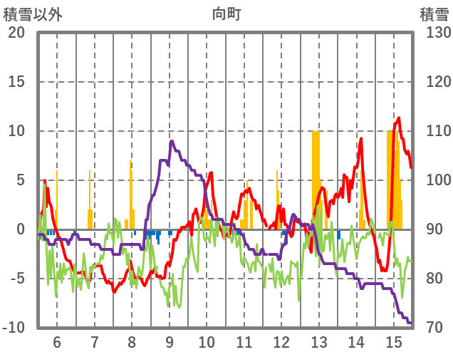 | 日 | 時 | 気温 | 降水 | 風向/風速 | 日照 | 積雪 | 降雪 |