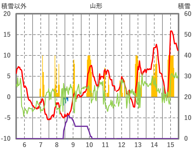 | 日 | 時 | 気温 | 降水 | 風向/風速 | 日照 | 積雪 | 降雪 |