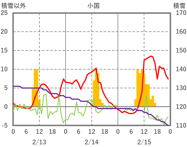| 日 | 時 | 気温 | 降水 | 風向/風速 | 日照 | 積雪 | 降雪 |