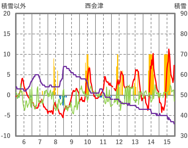 | 日 | 時 | 気温 | 降水 | 風向/風速 | 日照 | 積雪 | 降雪 |