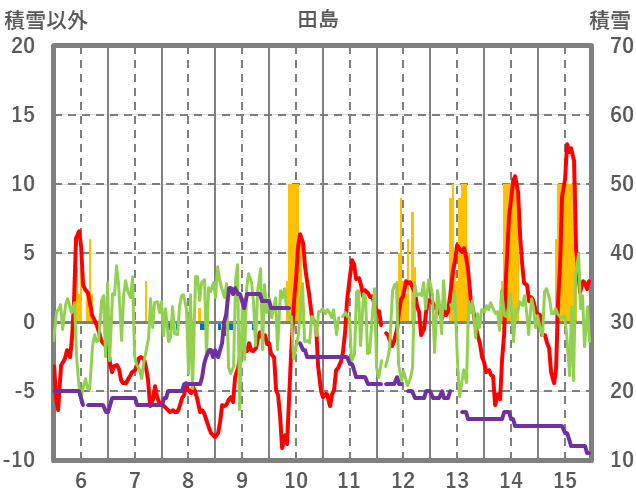 | 日 | 時 | 気温 | 降水 | 風向/風速 | 日照 | 積雪 | 降雪 |