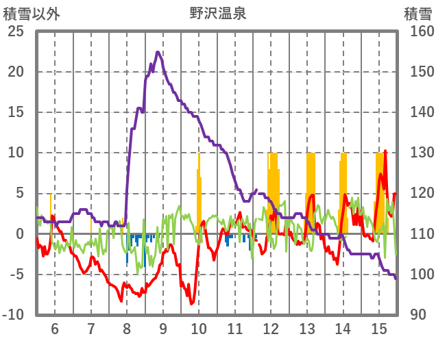 | 日 | 時 | 気温 | 降水 | 風向/風速 | 日照 | 積雪 | 降雪 |