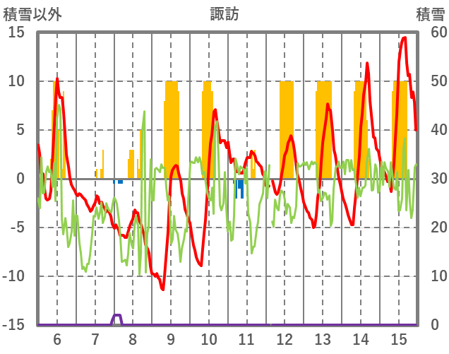 | 日 | 時 | 気温 | 降水 | 風向/風速 | 日照 | 積雪 | 降雪 |