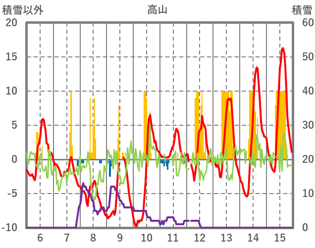 | 日 | 時 | 気温 | 降水 | 風向/風速 | 日照 | 積雪 | 降雪 |