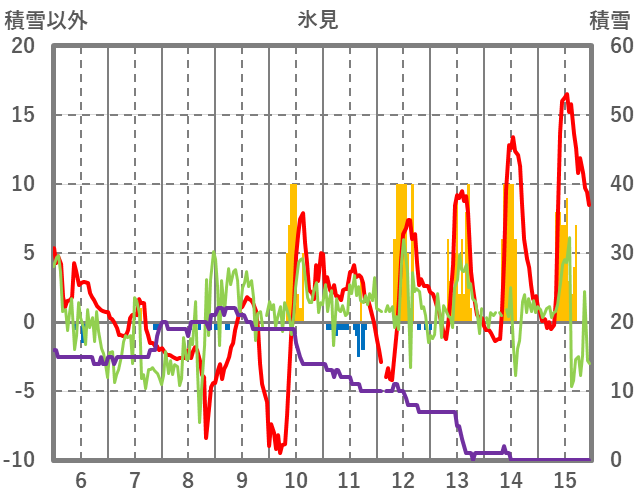 | 日 | 時 | 気温 | 降水 | 風向/風速 | 日照 | 積雪 | 降雪 |