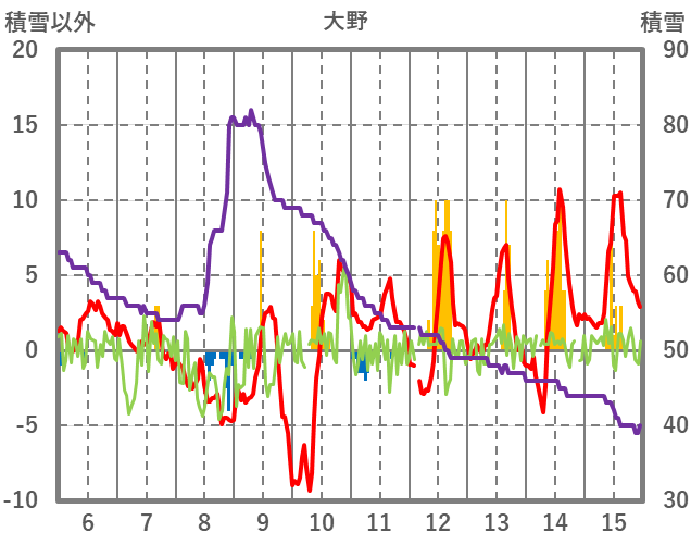| 日 | 時 | 気温 | 降水 | 風向/風速 | 日照 | 積雪 | 降雪 |