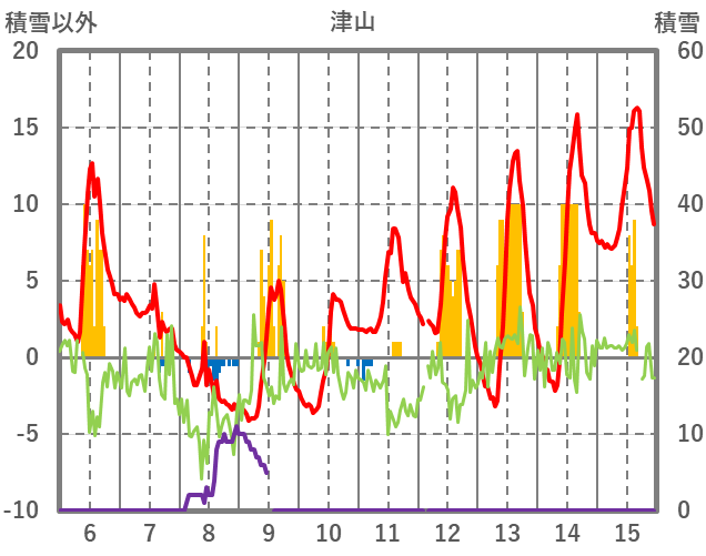 | 日 | 時 | 気温 | 降水 | 風向/風速 | 日照 | 積雪 | 降雪 |