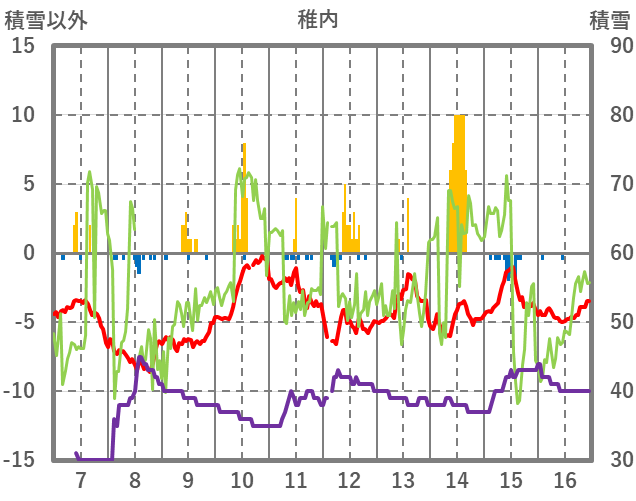 | 日 | 時 | 気温 | 降水 | 風向/風速 | 日照 | 積雪 | 降雪 |