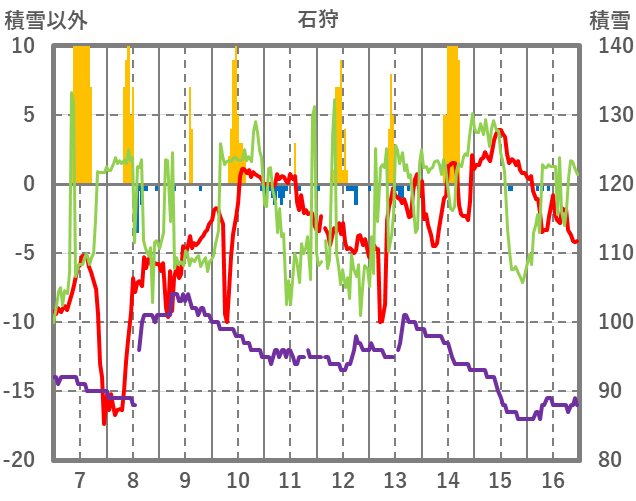 | 日 | 時 | 気温 | 降水 | 風向/風速 | 日照 | 積雪 | 降雪 |