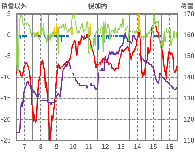 | 日 | 時 | 気温 | 降水 | 風向/風速 | 日照 | 積雪 | 降雪 |