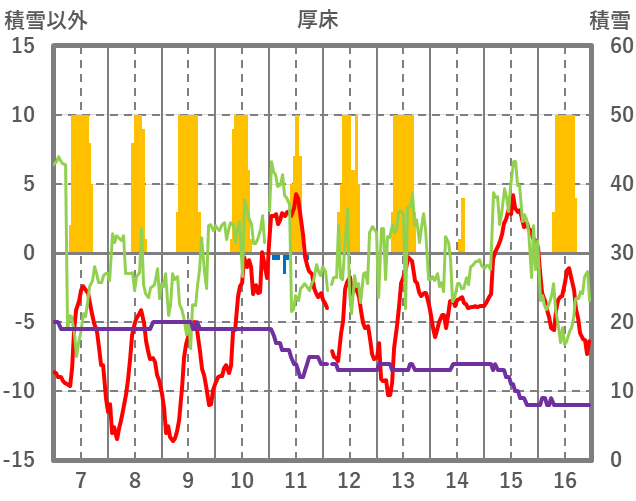 | 日 | 時 | 気温 | 降水 | 風向/風速 | 日照 | 積雪 | 降雪 |