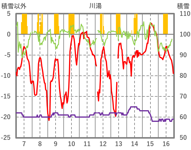 | 日 | 時 | 気温 | 降水 | 風向/風速 | 日照 | 積雪 | 降雪 |