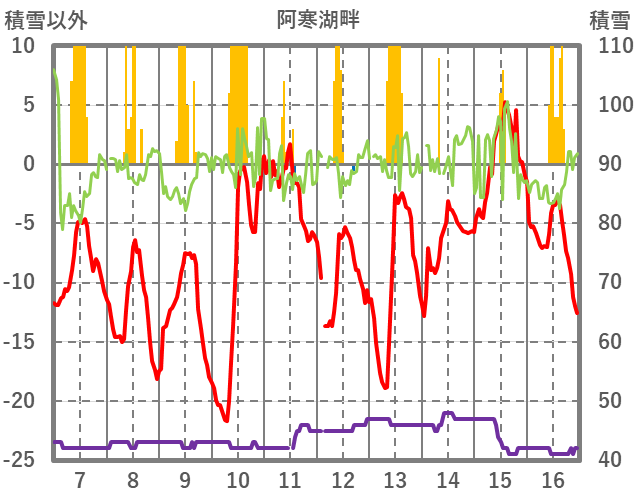 | 日 | 時 | 気温 | 降水 | 風向/風速 | 日照 | 積雪 | 降雪 |