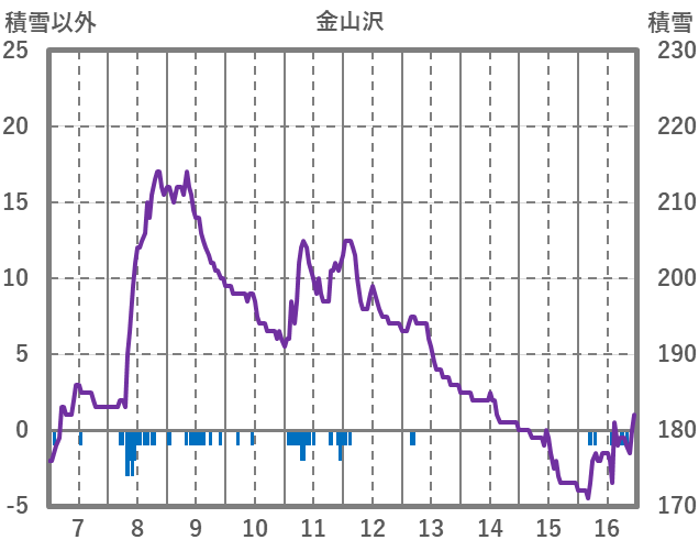 | 日 | 時 | 気温 | 降水 | 風向/風速 | 日照 | 積雪 | 降雪 |