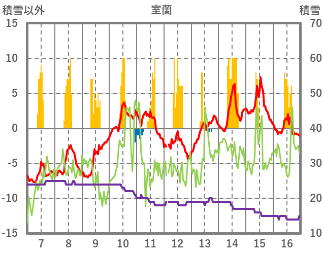 | 日 | 時 | 気温 | 降水 | 風向/風速 | 日照 | 積雪 | 降雪 |