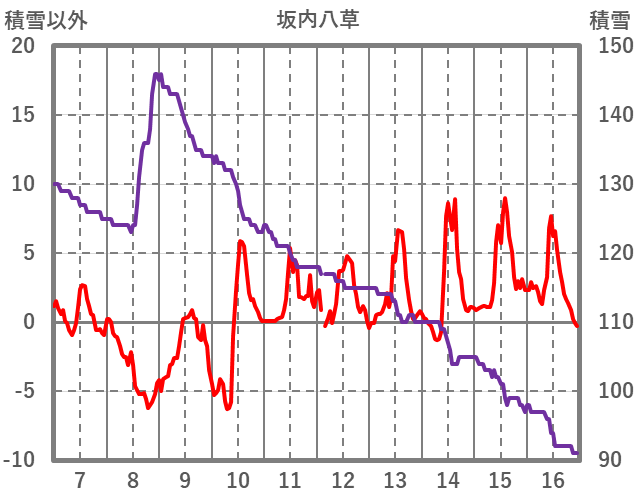 | 日 | 時 | 気温 | 降水 | 風向/風速 | 日照 | 積雪 | 降雪 |