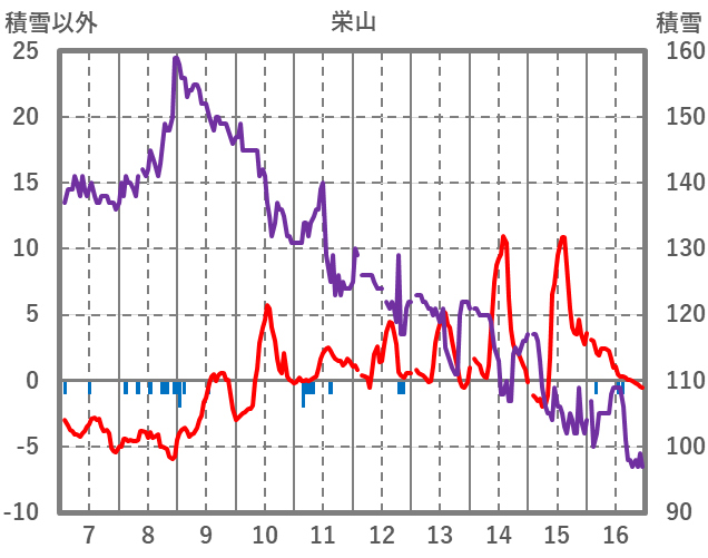 | 日 | 時 | 気温 | 降水 | 風向/風速 | 日照 | 積雪 | 降雪 |