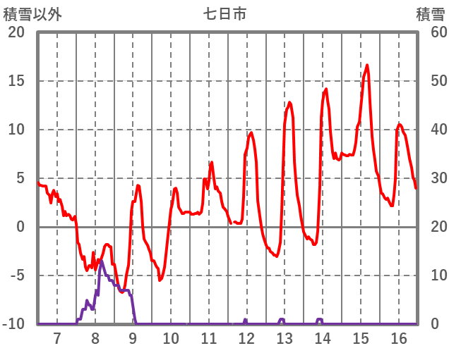 | 日 | 時 | 気温 | 降水 | 風向/風速 | 日照 | 積雪 | 降雪 |