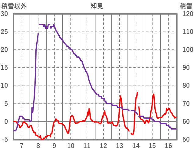 | 日 | 時 | 気温 | 降水 | 風向/風速 | 日照 | 積雪 | 降雪 |