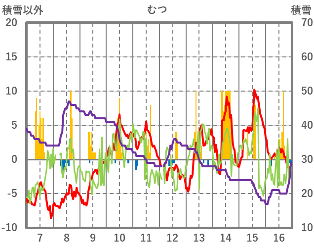 | 日 | 時 | 気温 | 降水 | 風向/風速 | 日照 | 積雪 | 降雪 |