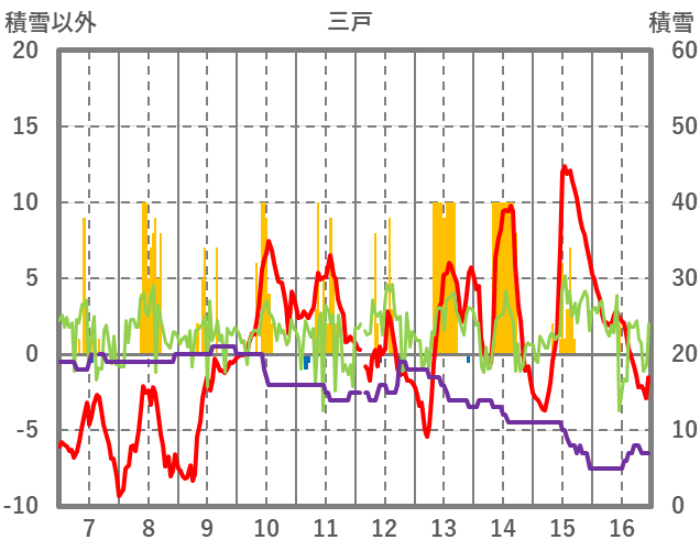 | 日 | 時 | 気温 | 降水 | 風向/風速 | 日照 | 積雪 | 降雪 |
