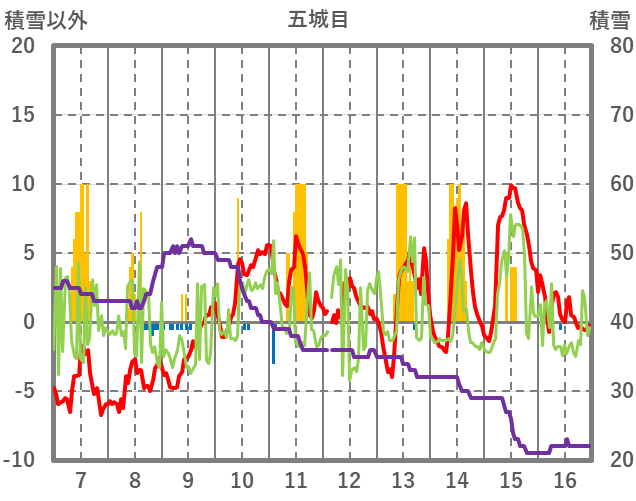 | 日 | 時 | 気温 | 降水 | 風向/風速 | 日照 | 積雪 | 降雪 |